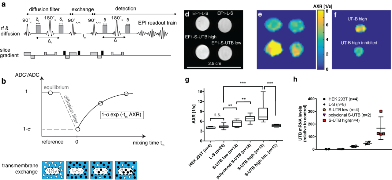 Recently, a novel MRI contrast mechanism based on pulsed field gradient magnetic resonance methods has been introduced for in vivo measurements, which detects transmembrane water exchange, quantified by the so-called apparent exchange rate (AXR). The technique named ‘filter-exchange imaging’ (FEXI) relies on a dual diffusion-weighted MRI sequence and has been pioneered by a group of researchers from Lund University. In our recent publication in Nature Biotechnology we showed that it is even sensitive enough to pick up a small amount of ca. 100,000 cells that have been genetically modified to express water channel proteins thereby altering their transmembrane water permeability (Figure 2).